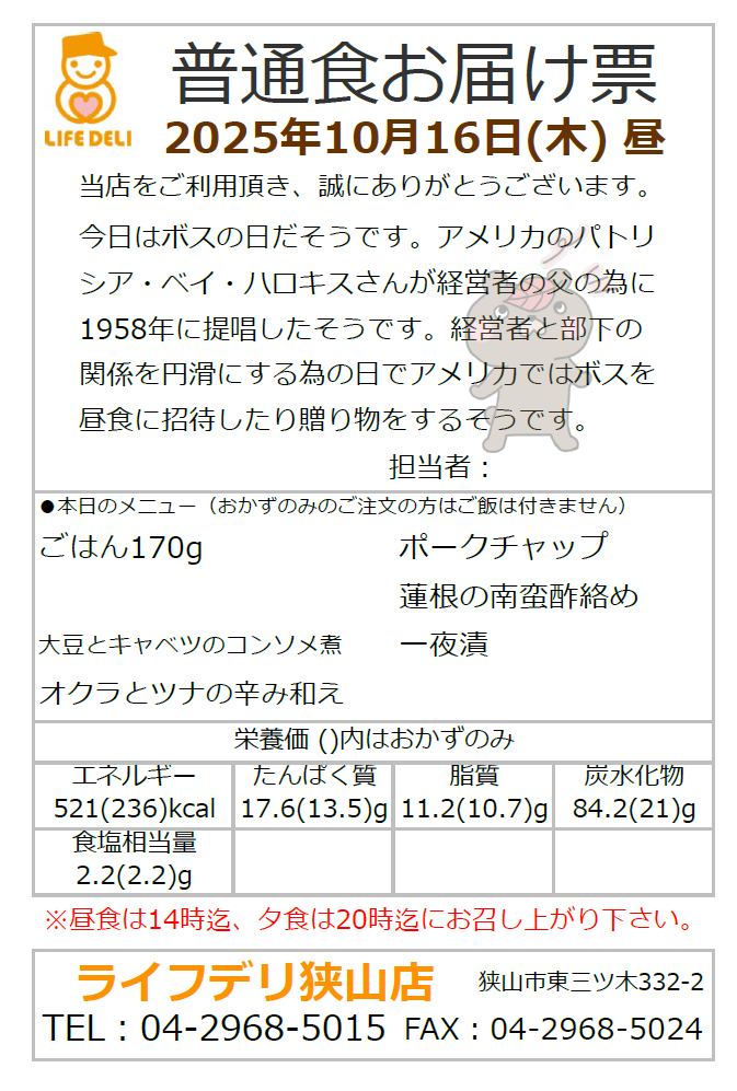 ライフデリ狭山店では、ご試食・ご注文は配達日の前日18時まで承っております。