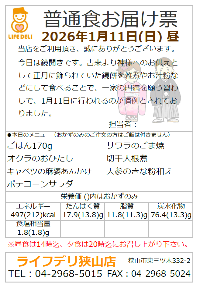 ライフデリ狭山店では、ご試食・ご注文は配達日の前日18時まで承っております。