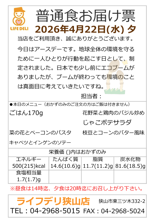 ライフデリ狭山店では、ご試食・ご注文は配達日の前日18時まで承っております。